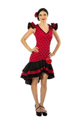 Put your dancing shoes on and get ready to party in this Flamenco Dancer Costume! Features red dress with black polka dots and ruffle accents! Also includes red flower hair clip and red rose pin as seen on dress