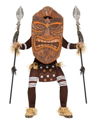 Don't forget the oversized tiki face mask featuring a wooden carving appearance to bring some authenticity to your costume! Do something different than everyone else and transform into this wooden figure ready for a battle this Halloween! Tiki Warrior Adult Mens Costume includes: Jumpsuit Belt Wrist cuffs Ankle cuffs Oversize mask Spears not included