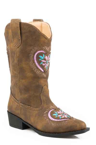 Roper Kids Daisy Heart Snip Toe Brown Boots The Roper Kids Daisy Heart Western Boots feature an adorable glitter heart underlay on the 9"" shaft and vamp