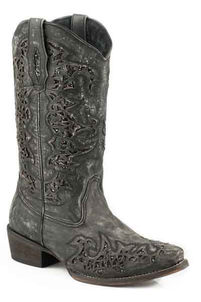 Roper Ladies' Shelby Snip Toe Black Western Boots Features: Handmade 12' shaft Black sanded leather with silver glitter underlay design shaft and vamp Double welt All leather lining Leather walking heel Padded insole for comfort Pull tabs for easy use Item Specifications: Style: Shelby Shaft Height: 12"" Toe: Snip Toe Heel: Walking Model Number: 09-021-0923-1041BL
