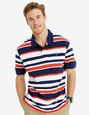 Short-sleeves Button placket with fold down collar Color contrasting embroidered small pony logo Classic polo style shirt Contrast navy, red and white bar stripes 100% cotton Machine washable Imported